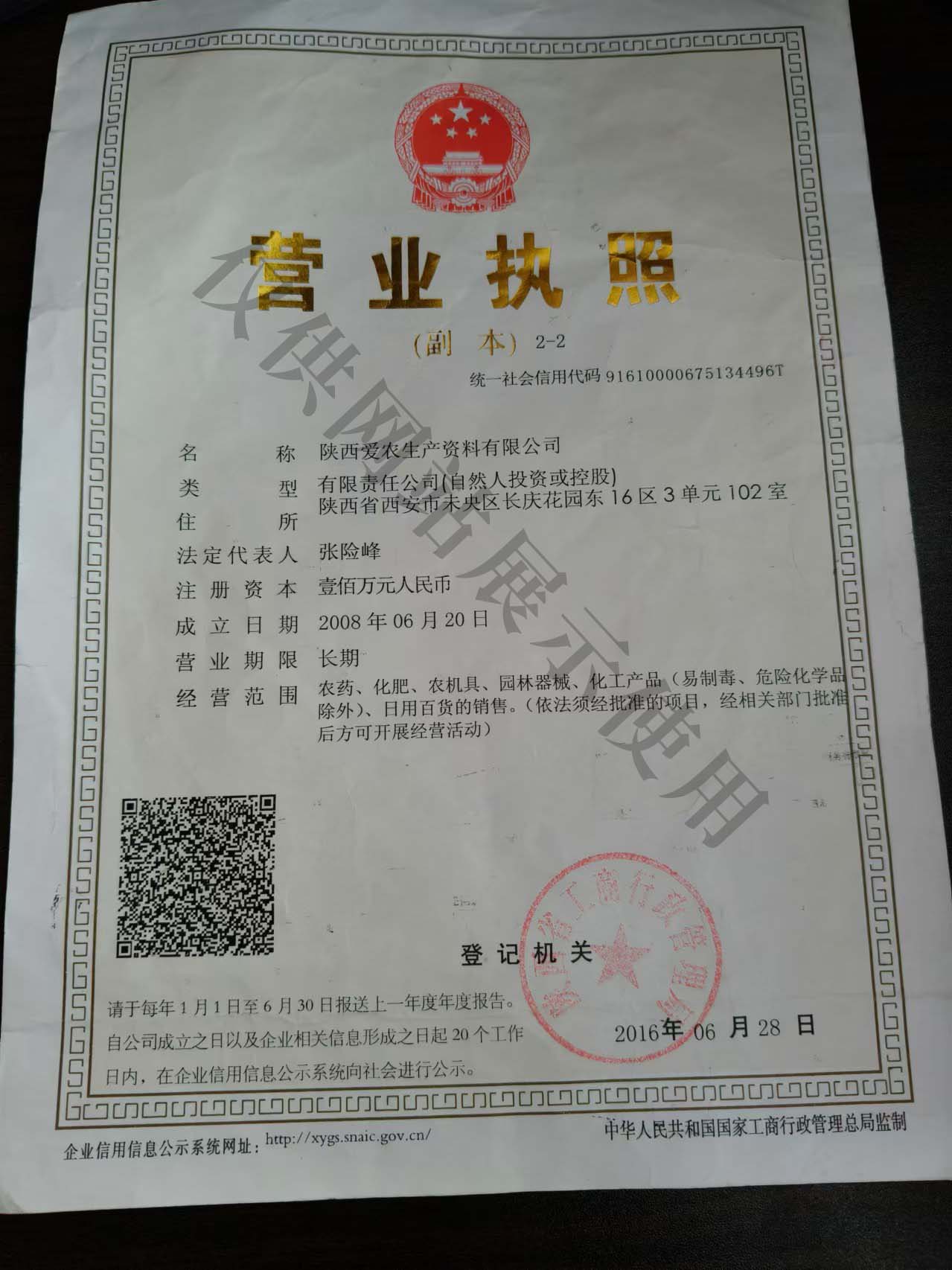 陕西爱农生产资料有限公司成立于2008年6月20日,是一家致力于为农业生产服务的综合性企业。公司自成立以来,始终秉承“服务三农,助力丰收”的经营理念,以诚信经营、品质服务赢得了广大客户的信赖和支持。【陕西爱农生产资料有限公司】